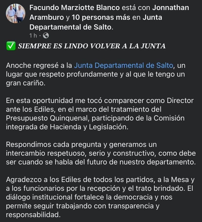 La intervención del director Facundo Marziotte ante la Junta Departamental de Salto dejó más frases bonitas que información real en pleno tratamiento quinquenal, participando de la comisión integrada de Hacienda y Legislación.