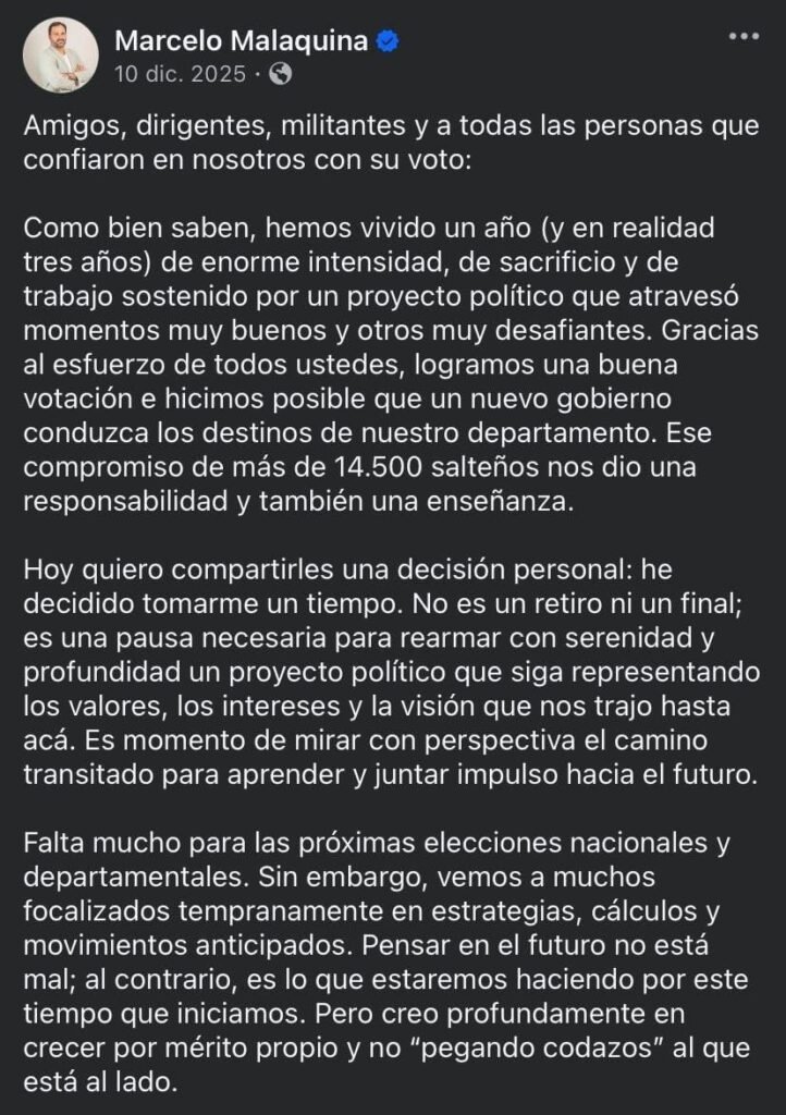 El mensaje publicado el 10 de diciembre del 2025 por el ex candidato a la intendencia deja una sensación ambigua que, lejos de transmitir claridad política, parece cuidadosamente redactada para decir mucho sin afirmar nada concreto. El anuncio de que “se toma un tiempo” aparece envuelto en un tono reflexivo, casi introspectivo, pero con frases que sugieren movimientos internos y tensiones no explicitadas.